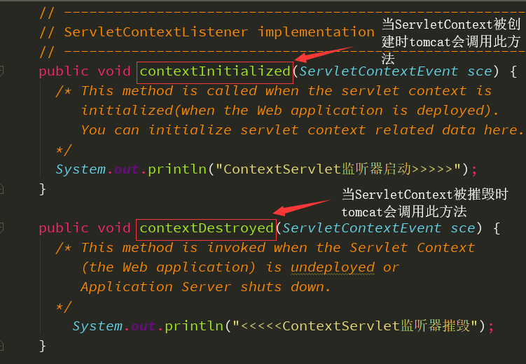- 创建时调用contextInitialized(ServletContextEvent sce)方法