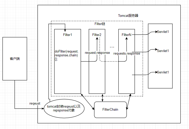 - FilterChain:过滤器链对象,通过该对象的doFilter方法可以放行该请求